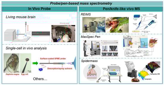 Highlights of in vivo analysis using MS biosensor techniques. Probe mass spectrometry, mainly PESI, for biopsies of various organisms [,,] is shown on the left panel. The right panel shows pen/knife-like in vivo MS technology including REIMS [], MasSpec Pen [], and SpiderMass [,]. Copyright with permission from Wiley, Elsevier, American Chemical Society.