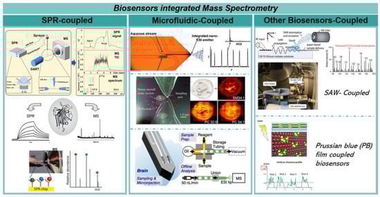 Highlights of different sensor technologies coupled with mass spectrometry including online and offline integration of SPR technology [,,], combination of microfluidic sensing chips [,,], and integration of other biosensors [,,,]. Copyright with permission from Wiley, Elsevier, Royal Society of Chemistry, American Chemical Society.