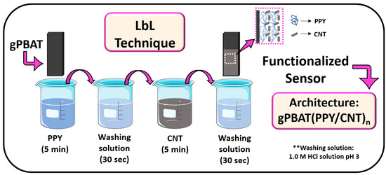 Composites based on biodegradable polymers and carbon-containing materials—such as graphite—are an interesting alternative in the field of sensors due to their mechanical, electrical, and thermal characteristics [1,2]. Nanocomposites manufactured using the layer-by-layer (LbL) technique are commonly applied to modify the sensors’ surface, making the device more attractive. Through this technique, it is possible to obtain ultrathin films with organized structures and properties on the molecular scale of the materials, whose deposition is independent of the substrate’s nature, size, or topology [3,4].