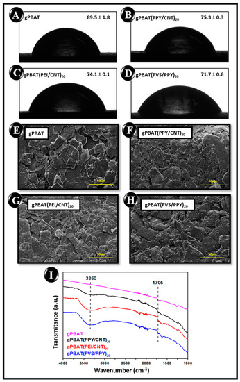 Contact angle analysis: (A) gPBAT, (B) gPBAT(PPY/CNT)20 LbL film, (C) gPBAT(PEI/CNT)20 LbL film, and (D) gPBAT(PVS/PPY)20 LbL film. Morphological analysis using SEM: (E) gPBAT, (F) gPBAT(PPY/CNT)20, (G) gPBAT(PEI/CNT)20, and (H) gPBAT(PVS/PPY)20. FTIR spectra, (I) The changes in the gPBAT electrode after coating with the three types of nanostruc-tured LbL film.