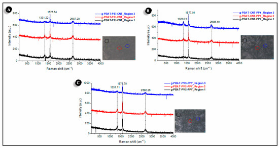Raman analysis from three different spots on the LbL electrode surface for the following electrodes: (A) gPBAT/PEI/CNT, (B) gPBAT/CNT/PPY, and (C) gPBAT/PVS/PPY.