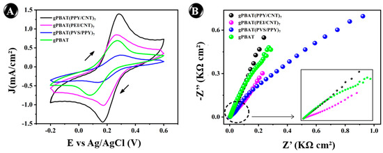 Comparison of gPBAT(PPY/CNT)7, gPBAT(PEI/CNT)7, and gPBAT(PVS/PPY)7 architectures and gPBAT (pure) for CV (A) and EIS (B) parameters. Conditions: CV was used in the potential range of −0.2 V to +0.6 V with a scan rate of 50 mV·s−1; EIS was employed in the frequency range of 0.1 Hz to 1 × 105 Hz. All measurements were performed in 5 mM K3[Fe(CN)6] medium containing 0.1 M KCl as a supporting electrolyte.