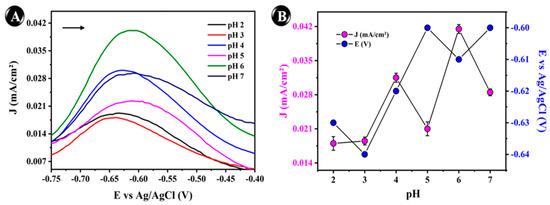 (A) DPV profiles for PQ at 0.50 µM in the 0.1 M PBS solution, pH (2.0–7.0), using the gPBAT(PPY/CNT)7 electrode. (B) Effect of pH value on current density and anodic potential peaks for PQ (DPV conditions: scan rate 50 mV·s−1 and potential range from −0.75 V to 0.40 V).