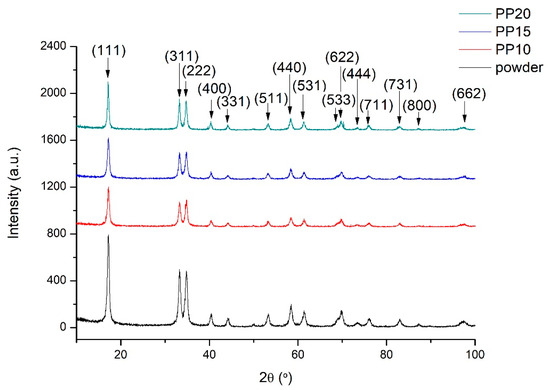 The incorporation of 10–20 wt.% of PVA decreases the intensity of the peaks in the XRD patterns of PP10, PP15, and PP20 when compared to the ones observed for pure PAA. In the case of PP20, the additional peaks with low intensities appear at 2θ = 39.663, 68.912, and 70.313° in the XRD pattern, corresponding to the low crystalline binder, PVA.