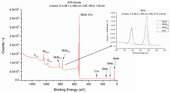Since the detection limit of the XRD technique is 3–5 wt.%, the synthesized PAA powder was subjected to an XPS analysis to confirm the complete oxidation of Sb (III) to Sb(V) during the synthesis. The XPS data are presented in Figure 2. As seen, the sample contains peaks corresponding to Sb and O. A low admixture of carbon, characterized by the C1s peak with a binder energy of 285 eV, is also present in the sample. It is likely due to some amount of CO2 adsorbed on the surface of Sb2O5·3H2O powder. As seen, the Sb3d5/2 peak with the binding energy of 531.5 eV is overlapped with the O1s peak. So, the Sb3d3/2 peak is typically used to identify the oxidation state of antimony, which typically is found at the binding energy of 542 eV [50]; see Figure 2 inset. To verify the oxidation state of Sb, the sample was sputtered with argon, promoting the reduction of Sb5+ ions to Sb3+ ions. As seen in Figure 3, after sputtering with Ar, the intensity of the O1s peak at 530.95 eV dropped. The fitting of the spectrum of the treated sample shows the presence of two peaks at low binding energies, 532.25 eV and 541.5 eV, which are attributed to low oxidation states of the Sb ions below +5. The experiment with reduction by Ar confirms that PAA, after synthesis, contains only Sb5+, as required for sensor development; consequently, the complete oxidation of antimony was confirmed.