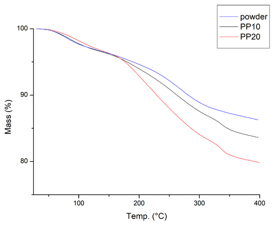 Thermogravimetry analysis, TGA, of the powder, and of PP10 and PP20 samples.