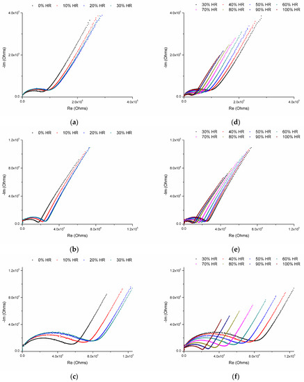 RH-variation Nyquist plots: (a–c) low-humidity range for PP10, PP15, and PP20 samples, respectively; (d–f) high-humidity range for PP10, PP15, and PP20 samples, in this order.