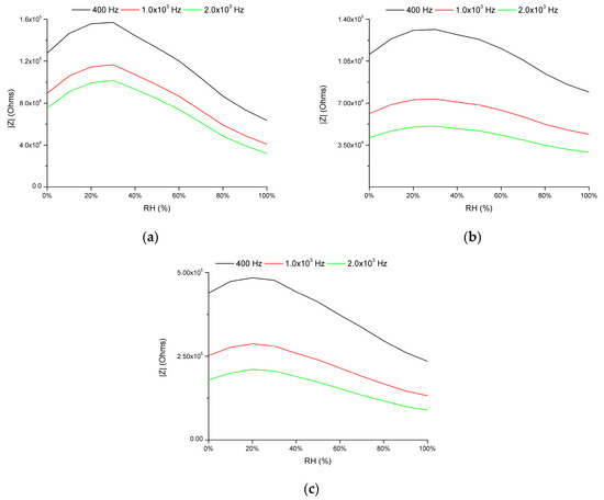 Impedance modulus variations with RH for three different excitation frequencies: (a–c) for PP20, PP15, and PP10 samples, respectively.