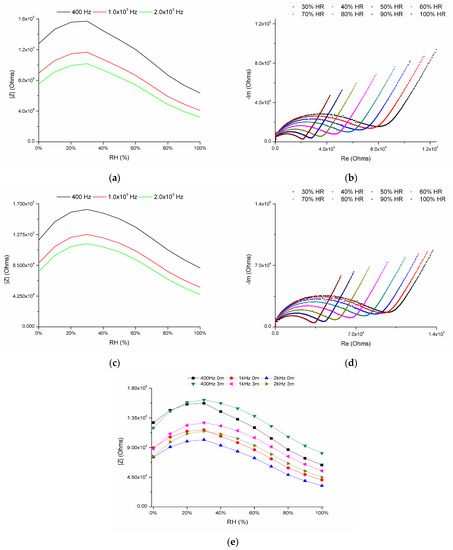 Additionally, and when comparing to previous published results also obtained for PAA-based samples [40], obtained using a fluoroplastic-type binder, the present work’s results, where PVA was used, allowed for enhancing moisture sensitivity and diminishing ageing (the estimated standard deviation using the determined impedance modulus traces for both periods is 5.7 kΩ, which is relatively low considering that the sensor impedance modulus varies mainly in the hundreds of the kΩ range). Indeed, a close comparison between the best results previously published (see Figure 11) and the finest ones from the present work (see Figure 10) allows for demonstrating the just-mentioned facts. In addition, and from the same sets of plots, it can be concluded that overall moisture sensitivity was increased; indeed, the overall impedance modulus variation above 30% RH was also increased, from around 0.4 to around one order of magnitude, at 400 Hz.