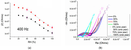Electrical analysis of PAA samples fabricated using a fluoroplastic-type binder: (a) impedance modulus variation of PAA with RH; (b) Nyquist plots taken with 1-year difference [40].