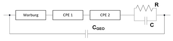 The level of superposition obtained is extremely high, proving that the chosen model is suitable for representing samples’ electrical response to moisture. As discussed, the considered contributions are the following: (1) one element consisting of a resistor in parallel with a capacitor (representing the grain and grain agglomerates’ contribution); (2) due to water coverage on the material surface, two constant phase elements are considered, CPE1 and CPE2, that stand for the charge diffusion contributions that take place at the interface between the electrodes and the material, and along grain boundaries; (3) a Warburg-type element, Warburgcoefficient, for representing the significant ionic diffusion contribution (the semi-infinite line visible in the Nyquist plots), which is mainly due to the surface paths for charge transport along the pores’ surface and along pores that become gradually filled with water molecules; and (4) a geometric capacitance, Cgeo, that contemplates the geometric effects’ contribution due to the electrodes’ location, which are placed on the far ends of the upper faces of the samples (this placement resembles a capacitor with parallel plates).