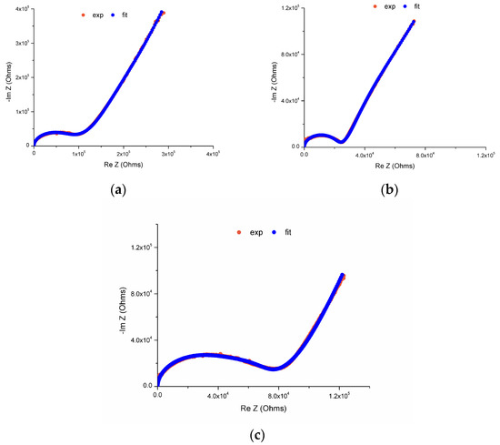 PP10, PP15, and PP20 Nyquist plots at 20% RH, and respective fitted curves, (a–c).