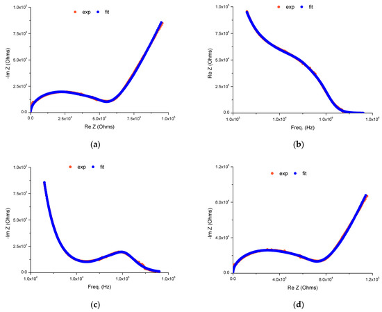 From the plotted fittings, the adequation of the studied and developed equivalent model could be confirmed; without a doubt, both the Nyquist and Bode fits show a high agreement with the obtained experimental data; see Figure 13 and Figure 14. For all samples, Figure 13 displays the obtained experimental response to an RH concentration of 20% and their respective fitted curves with the proposed electrical equivalent circuit using Nyquist representations.