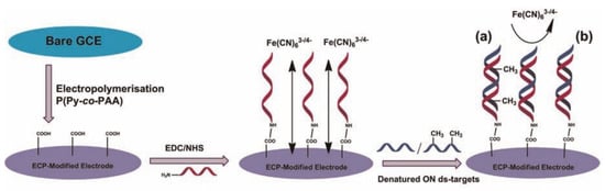 Schematic representation of DNA sensor based on ECP, including steps of electrocopolymerization, probe attachment, and hybridization with (a) methylated and (b) unmethylated denatured ds-ON target []. Copyright 2015, Elsevier.