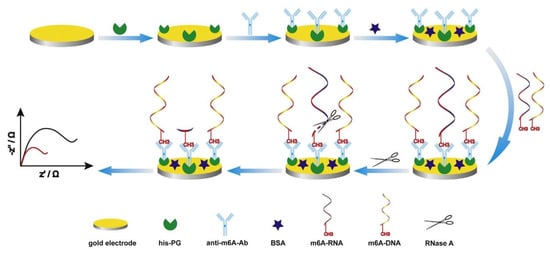Xie’s group developed a sensitive and label-free electrochemical immunosensor for m6A-RNA detection, utilizing the advantages of the sensitivity and selectivity of electrochemical biosensing technology (Figure 2) []. The key to achieving sensitivity and specificity in the developed method is the use of the specific interaction between antibody (Ab) and antigen (Ag). The authors used recombinant proteins tagged with histidine to modify the gold electrode surface. Histidine binds to the gold electrode surface, allowing the recombinant protein to be oriented. The specificity of the Ab crystal region and recombinant protein binding was then used to expose the Ab binding site, thereby improving the binding efficiency of the Ag-Ab, enhancing the detection signal, and enabling the detection of low-abundance m6A-RNA. The anti-m6A-Ab used in this method can bind to both m6A-RNA and m6A-DNA. M6A-DNA serves as a signaling molecule and participates in the reaction together with m6A-RNA. After binding to the Ab, RNase A is used to hydrolyze the bound m6A-RNA. The amount of m6A-RNA is quantified by the decrease in the EIS signal. The linear range of detection can be improved by using a method of competition reaction with m6A-DNA and m6A-RNA, followed by degradation. Finally, the EIS signal of the detection electrode is detected, and the decrease of signal intensity is proportional to the abundance of m6A-RNA, while the intensity of the signal is inversely proportional to the amount of m6A-RNA in the sample. This biosensor has the advantages of simplicity and sensitivity, with a wide detection range and a sensitivity of up to 0.016 nM. This method for detecting RNA methylation is not affected by chain length or base sequence and has a certain degree of universality.