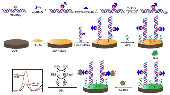 Chen’s group took advantage of the high sensitivity of electrochemistry and used a signal labeling strategy to detect low-abundance 5-formyluracil (5fU), which is closely related to the function of DNA (Figure 3) []. The most critical step of this method is to signal-modify the target site of 5fU-DNA. The authors first used the azide derivative of (2-phenylimidazole) acetonitrile and the aldehyde group of 5fU to form a covalent bonding through a chemical reaction. Then, DBCO-PEG4-biotin was connected to the target DNA through a copper-free click chemistry reaction. Next, T4 polynucleotide kinase was used to catalyze the target DNA to generate a sulfhydryl group at the 5′ end. The target DNA containing 5fU can be assembled on the electrode surface by the interaction of Au-S bond. Finally, specific recognition between biotin and streptavidin was used to label horseradish peroxidase onto the surface of the above electrode. Horseradish peroxidase catalyzed the oxidation and reduction of hydroquinone to generate an electric current signal. Differential pulse voltammetry (DPV) was used to detect the current and enable high-sensitivity detection of 5fU. The specificity of detection comes from the specific recognition of azide to 5fU. Introducing a biotin label at the position of 5fU and then combining it with streptavidin-horseradish peroxidase can significantly improve the detection sensitivity. Using T4 polynucleotide kinase to directly connect the target DNA onto the electrode through a covalent bond is more direct and does not require a capture probe. This method can avoid interference from 5-formylcytosine and apyrimidinic sites in the detection of 5fU. At the same time, this direct bonding method also avoids the sequence matching problem caused by the use of capture probes in traditional connection methods. This method has a good linear range and a low detection limit.