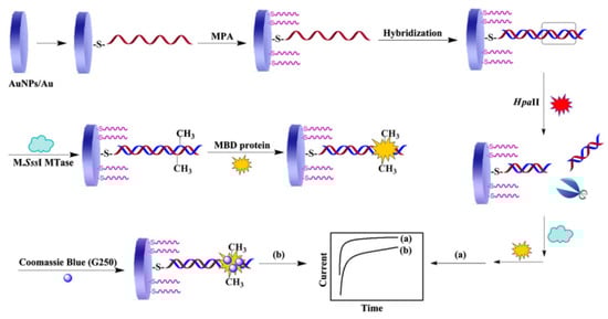 Ai’s group developed a biosensor to detect cytosine methylation of CpG dinucleotides and the activity of methyltransferase (MTase) in DNA, using a methyl-binding domain (MBD) protein that can specifically bind to CpG dinucleotides and Coomassie brilliant blue G250 (CBB-G250) as the signal label (Figure 4) []. This sample method can also be applied to screen for MTase inhibitors. The process of this method is to fix the capture DNA probe on the electrode using the Au-S bond firstly and then hybridize the target DNA with the capture DNA probe. Treatment of the hybridized DNA with M.SssI-MTase in the presence of the methyl donor S-adenosylmethionine can methylate CpG dinucleotide specific sites. The methylated CpG region can be specifically recognized and bound by the MBD protein. CBB-G250 can bind to the MBD protein through intermolecular forces. CBB-G250 is a common electroactive molecule that can provide redox signals to methylated DNA. When the CCGG symmetrical sequence of the hybrid molecule is specifically recognized and cut by the Hpall restriction endonuclease, it cannot be methylated by MTase. The amperometric current method is used to detect the redox signal of CBB-G250, and the obtained current signal can reflect the level of DNA methylation and the activity of MTase. The authors developed a simple, portable, and sensitive biosensor that can be used to detect DNA methylation and MTase activity, and it can also screen for methylation inhibitors.