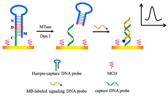 Yan’s group developed a sensitive and simple method for detecting MTase activity using hairpin DNA probes (Figure 5) []. The key design of this method is the elaborate design of the hairpin DNA probe. The 5′ end of this hairpin DNA probe is modified with a sulfhydryl group, which can directly generate an Au-S covalent bond with the gold electrode, fixing the probe on the electrode surface. The hairpin DNA probe also has a methylation recognition site. After treatment with MTase or restriction endonucleases such as Dam MTase and Dpn I that can recognize methylated sites, the hairpin DNA probe is cleaved. The remaining DNA fragments after cleavage are still left on the electrode as a capture probe that can hybridize with a signal probe. The signal DNA probe is modified with methylene blue, which can undergo redox reactions on the electrode surface. Unlike conventional detection methods where the signal is directly labeled on the target molecule, this method cleverly designs the capture probe to release and bind with the signal probe. When the hairpin DNA probe cannot be cleaved due to methylation, the capture probe cannot be released and cannot bind with the signal probe, avoiding false-positive results. This method is simple to prepare and easy to operate, and it has good selectivity and high sensitivity. The detection limit for Dam MTase using this method is 0.07 U/mL. This method can also be applied to the screening of inhibitors and the discovery of anticancer drugs. Yuan’s group evaluated the activity of DNA transferase using a commercial blood glucose meter []. This method used biotin-avidin-peroxidase as a label to achieve sucrose catalytic hydrolysis and used a blood glucose meter to convert the signal for detection.