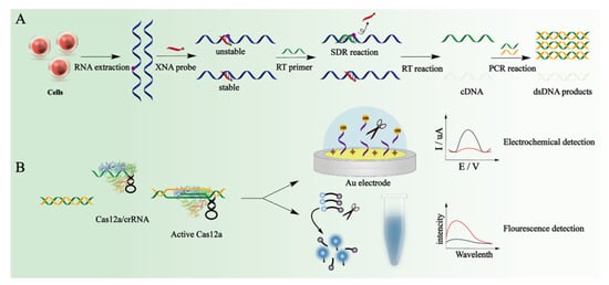 Liao’s group used the difference in the thermodynamic stability of hybridization between a xeno nucleic acid (XNA) probe with m6A-RNA and A-RNA to develop a specific reverse transcription polymerase chain reaction for m6A-RNA (Figure 6) []. Combined with the CRISPR/Cas12a signal amplification strategy, m6A modification can be detected with high sensitivity. In the detection process, RNA is extracted from cells to obtain RNA containing m6A-RNA and A-RNA without methylation modification. XNA probes are used to hybridize with RNA. Non-methylated RNA and XNA are more stable after hybridization, and the strand displacement reactions (SDR) with the reverse transcription primer occur slowly. Due to the hybrid of m6A-RNA and XNA being unstable, the m6A-RNA can preferentially undergo SDR with the reverse transcription primer. The reverse transcription of non-methylated RNA is blocked by the XNA probe, directly magnifying the minute differences between m6A-RNA and A-RNA. The single-stranded DNA obtained from the reverse transcription of m6A-RNA is PCR amplified to generate double-stranded DNA, which is positively correlated with the m6A fraction. The authors utilized the differences in thermodynamic stability between m6A-RNA and RNA hybridization with XNA and the difficulty of SDR to amplify the small differences in the first step after PCR amplification. Then, the CRISPR/Cas12a system is used to amplify the signal. The CRISPR-derived RNA (crRNA) in the designed CRISPR can specifically target the m6A RT-PCR amplification fragment. The CRISPR/Cas12a system is activated by the specific double-stranded DNA generated in the reverse transcription polymerase chain reaction and the realized signal amplification output. A methylene blue-modified DNA probe is immobilized on the gold electrode surface, and the remaining bare area of the Au electrode is blocked by MCH before adding the activated Cas12 reaction system. After the DNA probe is cut away from the electrode surface, the methylene blue molecules on the electrode are released. The abundance of m6A-RNA is quantified by detecting the decrease in the square wave voltammetry signal. In this study, the authors used a dual signal amplification system. After amplifying the signal with RT-PCR, the CRISPR/Cas12a system was used to further amplify the signal. The m6A-RNA can be detected with ultra-high sensitivity and can sensitively detect 1% m6A sites.