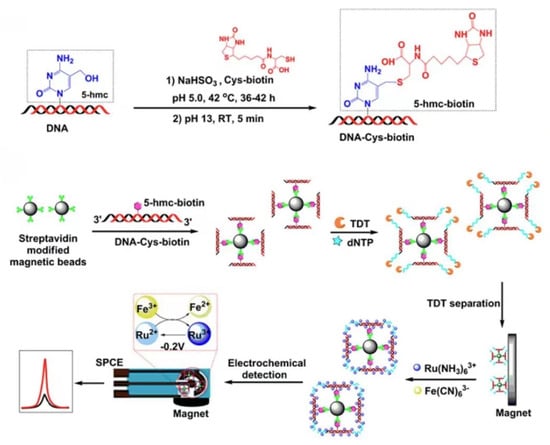 Compared with the dual signal amplification method based on nucleic acid complementary pairing, the following signal amplification method based on magnetic separation does not require a specific sequence design or signal labeling and can achieve signal amplification for the detection target. Zhang’s group developed an unlabeled electrochemical magnetic biosensor for the quantitative detection of 5-hydroxymethylcytosine (5-hmC) DNA, which is closely related to cancer and is an important epigenetic biomarker for tumorigenesis (Figure 7) []. The core of this method is coupling with the terminal deoxynucleotidyl transferase (TDT) enzyme-catalyzed amplification and Ru(III) redox cycling, a dual signal amplification system, to significantly improve the sensitivity of the detection. In the detection process, 5-hmC is first modified and enriched. The 5-hmC specific site in the non-paired double-stranded DNA is modified by a biotinyl-cysteine derivative. After purification using a Micro-Bio-Spin P6 column, biotin-coupled 5-hmC double-stranded DNA is obtained. Because biotin has good specificity with streptavidin, the biotin-coupled double-stranded DNA is bound to magnetic beads coated with streptavidin, which links the double-stranded DNA and magnetic beads to achieve the enrichment effect. The magnetic beads linked with double-stranded DNA are elongated by terminal deoxynucleotidyl transferase treatment. Ru(NH3)63+ is positively charged, which can be electrostatically attracted to the negatively charged phosphate backbone of DNA. They can be combined through electrostatic interaction, allowing Ru(NH3)63+ to reach the vicinity of the DNA main chain. The magnetic beads linked with DNA double-strands can bind to the screen-printed electrode surface through magnetic force without immobilization. Fe(CN)63− is negatively charged and repels the DNA main chain, making it difficult to contact. Ru(NH3)63+ directly participates in the electrochemical redox process. With Ru(III) being reduced to Ru(II), Ru(II) can react with Fe(CN)63−, causing Ru(II) to be oxidized to Ru(III) again. The regenerated Ru(III) can continue to bind with DNA to participate in the redox cycle. The redox process of Ru can further amplify the electrical signal. This electrochemical biosensing detection method has good specificity and can significantly distinguish 5-hmC from 5-methylcytosine. This method does not require specific templates or a special sequence design and is not limited to DNA with specific base sequences. Amplification is performed through molecular interactions without signal labeling. The dual signal amplification system enables a detection limit as low as 9.06 fM.