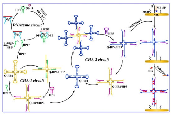 Based on a multi-step DNA amplification circuit design, Wang’s group developed a sensitive proportional electrochemical biosensor for detecting methylated DNA (Figure 8) []. The multi-step circuit amplification design, which is a non-enzymatic amplification design, can use the product upstream as the initiator of the downstream circuit, effectively achieving signal amplification. The core of the non-enzymatic electrochemical biosensor designed by the authors is the design of multi-step circuit amplification, mainly including three cycles. Introduction of methylated target DNA in the first cycle triggers a Mg2+-dependent DNA enzyme cycle, causing the hairpin structure to break and generate HP1*. The HP1* generated in the first cycle can act as an initiator for the second cycle, starting the CHA-1 cycle. QHP2/HP3 produced by the CHA-1 cycle can initiate the third cycle CHA-3, ultimately generating the four-way junction QHP4/QHP5. The multi-step amplification circuit is triggered by methylated target DNA and generates a DNA four-way junction after three cycles. The gold electrode surface is fixed with a capture probe, which binds to the signal probe of methylene blue. The DNA four-way junction can bind to the capture probe, undergo strand displacement reaction, replace the original signal probe of methylene blue, and connect the DNA four-way junction to the electrode interface. The DNA four-way junction has sufficient sites to introduce doxorubicin molecules. By detecting the ratio of doxorubicin and methylene blue signals using electrochemistry, the methylated target DNA can be sensitively detected. The ratiometric method is a way to detect biomarkers based on the ratio of two independent signals, rather than using a specific signal output value. Using the ratio of two signals to detect can significantly improve the accuracy and precision of detection. The oxidation-reduction of doxorubicin and the signal probe of methylene blue can be used as a pair of signal reporters. Although the ratiometric method produces stable and repeatable signals, amplification methods are used to increase the limited sensitivity. The multi-step circuit amplification method exhibited high sensitivity for target analysis with a detection limit of 4 aM.