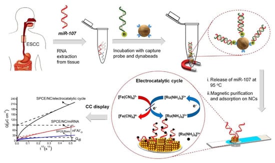 Schematic illustration of electrocatalytic detection of miR-107 using gold-loaded nanoporous superparamagnetic iron oxide nanocubes (Au-NPFe2O3NC) []. Copyright 2018, Elsevier.