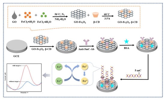 Chen’s group developed an electrochemical immunosensor that can use antibodies to recognize DNA bases to detect DNA methylation of unknown sequences (Figure 11) []. They prepared a GO-Fe3O4-β-CD nanocomposite material, which combines the advantages of GO-Fe3O4, which has good biocompatibility, a large specific surface area, and good dispersion, with β-CD, which has a hydrophobic cavity that can form stable host-guest complexes. The authors dropped the synthesized GO-Fe3O4-β-CD composite nanomaterial on the glassy carbon electrode surface, forming a stable nanointerface with a large number of cavities, which increased the surface area of electrode and provided many antibody binding sites. Then, they immobilized the antibody for 5-mC on the formed nanointerface. Through the specific interaction between the antigen and antibody, the target gene can be captured. After methylation DNA binds to the antibody, the Ru(NH3)63+/Fe(CN)63− redox amplification system is used for current amplification, significantly increasing the sensitivity of detection. The current detected by the electrochemical biosensor is related to the amount of methylated DNA. The method of modifying the interface using nanomaterials can achieve a detection limit of 0.0825 pm. Using capture antibodies instead of specific sequence DNA as capture probes can detect DNA methylation of unknown sequences, but there is an issue of poor detection specificity. The combination of electrochemical detection methods and nanotechnology can achieve high sensitivity.