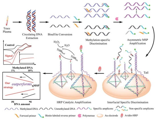 - Wang, X.; Chen, F.; Zhang, D.; Zhao, Y.; Wei, J.; Wang, L.; Song, S.; Fan, C.; Zhao, Y. Single copy-sensitive electrochemical assay for circulating methylated DNA in clinical samples with ultrahigh specificity based on a sequential discrimination-amplification strategy. Chem. Sci. 2017, 8, 4764–4770. [Google Scholar] [CrossRef]