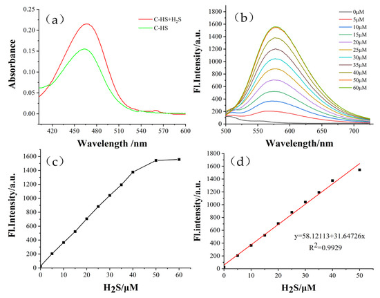 (a) UV absorption spectra of probe C-HS and recognizer H2S. (b) The fluorescence titration spectra of C-HS (10 μM) probe for different concentrations of H2S (0–60 μM) were studied. (c) Titration curve of probe C-HS and H2S. (d) Linear relationship between the fluorescence intensity of C-HS (10 μM) and the concentration of H2S (0–50 μM) at 575 nm (In the spectrum experiment, the incubation time of the probe and H2S was 30 min).