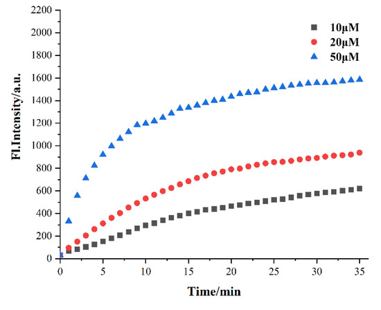 In order to detect the reaction rate of the probe C-HS with H2S, the fluorescence kinetics tests of the interaction between C-HS and three groups of H2S with different concentrations (10 μM, 20 μM, 50 μM) were carried out (Figure 2). When the probe C-HS (10 μM) reacted with different concentrations of H2S, the fluorescence intensity of the probe C-HS increased gradually with time. When interacting with 50 μM of H2S, the fluorescence intensity of the test system increased rapidly at first, and the rate of fluorescence intensity change gradually decreased after 10 min of interaction. Even though the response time of 10 min was not short, it was acceptable for the detection of H2S in biological samples. It is because the common incubation time settings in bioimaging are 10, 15, or 30 min [45,46,47,48].
