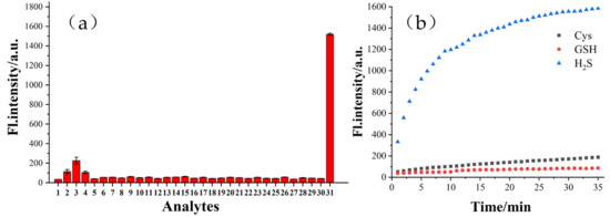Up to now, there are some traditional detection methods, including colorimetry, potentiometric determination, polarographic analysis, and gas chromatography, have already been presented for H2S detection [1,2,4,13]. Nevertheless, these methods are not applicable to H2S detection at the cellular level or in vivo. Fluorescence techniques are increasingly popular because of excellent sensitivity and specificity, short detection time, low cost, simple operation, and high spatial and temporal resolution [16,17,18,19]. Therefore, fluorescence technology to detect H2S is undoubtedly an excellent method. However, some of the H2S fluorescence probes developed at this stage interfere with other biothiols, including cysteine (Cys), homocysteine (Hcy), and glutathione (GSH), which have similar reactivity with H2S [18,20,21,22,23,24,25,26]. These biological thiols possess sulfhydryl groups that may not only exhibit chemical properties similar to those of H2S but also coexist with H2S in complex biological environments, seriously interfering with the detection of H2S by fluorescence probes. Therefore, developing fluorescence probes that could effectively distinguish H2S from other biothiol molecules is essential for further studies on hydrogen sulfide’s biological functions and pathological effects.