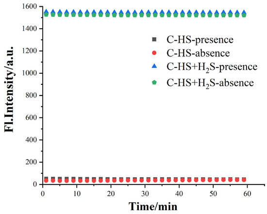 Optical stability is an important factor for judging the excellent performance of fluorescent probes. In order to test the optical stability of the probe, the probe C-HS was continuously irradiated at 470 nm excitation wavelength for fluorescence scanning. As shown in Figure 5, within 60 min, the probe C-HS with and without H2S addition showed high chemical stability.