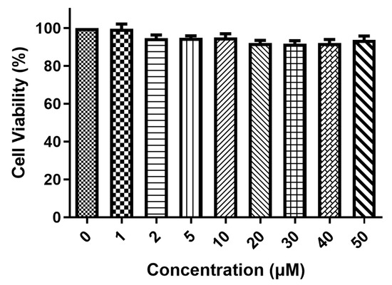 As a fluorescence tracer, the fluorescence probe C-HS should provide good biocompatibility and not have toxic effects on biological samples. Therefore, before biological imaging applications, the survival of cells in the presence of the probe C-HS was tested using standard MTT methods to ensure that the probe C-HS would not cause unnecessary damage to the biological sample. The HeLa cells maintained more than 95% viability after 24 h incubation with the probe (0–50 μM). As shown in Figure 6, the results showed that the probe C-HS had low toxicity to cells and could be applied to biological samples.