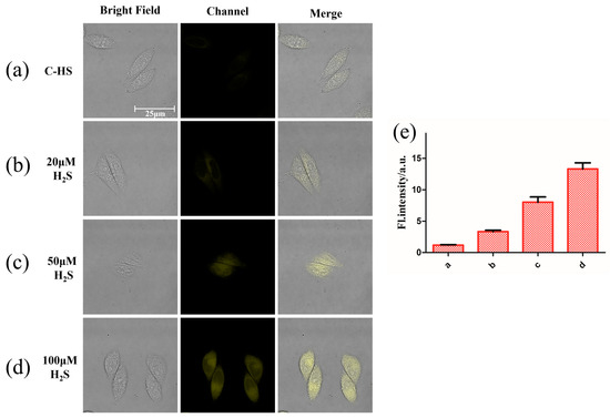 After verifying that probe C-HS has good cytocompatibility, the ability of probe C-HS to detect intracellular H2S concentration changes was verified by exogenous H2S imaging experiments of cells. The HeLa cells incubated with the 10 μM probe C-HS alone exhibited a faint yellow fluorescence signal, indicating that the probe could sensitively recognize the sparse intracellular H2S (Figure 7a). Subsequently, after pretreatment with H2S and the addition of probe C-HS, the fluorescence signals of HeLa cells were enhanced. And the fluorescence cells released by HeLa cells gradually increased as the concentration of extracellularly added H2S increased (Figure 7b–d). The results of cellular exogenous H2S fluorescence imaging experiments (Figure 7e) showed that the probe C-HS was able to effectively detect intracellular H2S content change and re-validated the design strategy of the probe C-HS to recognize H2S.