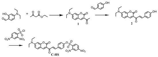 The synthetic rote is outlined as Scheme 1. The coumarin–chalcone fluorescence platform has been widely used in the design of fluorescence probes [38,39,40,41,42,43,44]. By introducing an electron-withdrawing group to the fluorescence platform, the fluorescence emission signal could be modulated. In this work, the H2S fluorescence probe was constructed by using a coumarin–chalcone compound as the fluorescence platform and introducing a H2S recognition site, the 2,4-dinitrobenzenesulfonyl group, on this platform. The introduction of the 2,4-dinitrobenzenesulfonyl group caused the fluorescence probe C-HS to form a PET effect, thereby causing the fluorescence probe C-HS to show a weak fluorescence emission signal. The 2,4-dinitrobenzenesulfonyl group would undergo a specific nucleophilic reaction with H2S to form hydroxyl groups. As the hydroxyl group with strong electron-donating property, the electrical structure of the probe changed to “D-π-A”, and the intermolecular charge transfer (ICT) effect was restored to the coumarin–chalcone fluorophore, producing a strong fluorescence emission signal. In this paper, the structure of the compound was characterized by NMR and HRMS, and the recognition mechanism of the probe and hydrogen sulfide was verified by HRMS. Scheme 2 outlines the design strategy of the fluorescence probes and the response mechanism of H2S.