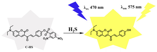 Hydrogen sulfide (H2S), which smells like rotten eggs, is an important endogenous signaling molecule in many physiological processes and has attracted a lot of attention. Endogenous H2S is usually produced by three unique enzymatic reactions, including cystathionine-β-synthetase (CBS), cystathionine-γ-lyase (CSE), and 3-mercaptopyruvate sulfurtransferase (3-MST) [1,2,3,4,5,6]. Studies have shown that the catalytic enzymes of endogenous H2S are distributed in various tissues of the body, and it has been shown that H2S plays a crucial role in a lot of physiological and pathological processes, such as neurotransmission, vasodilation, cardiac protection, angiogenesis, apoptosis, islet secretion, and anti-inflammation [6,7,8,9,10,11]. However, abnormal H2S levels could be very harmful to the body, causing diseases including Alzheimer’s disease, Down’s syndrome, diabetes, and cirrhosis [4,12,13,14,15]. Therefore, it is necessary to measure the content of endogenous H2S, which is to the benefit of understanding how H2S affects physiological activity and causes disease.