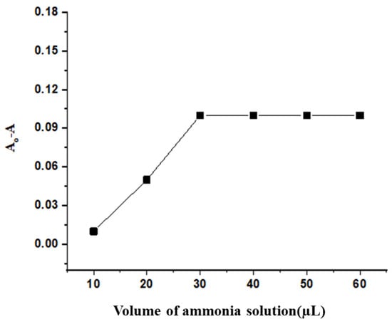 Absorbance measurements of the AgNPs were performed after the addition of various amounts of NH3, aiming at a sensitive response of the probe towards BPA. The addition of an ammonia solution of 10 to 60 µL from a 3 × 10−4 mol L−1 stock solution to the AgNP dispersion decreased the SPR NP band, confirming the formation of a AgNPs-NH3 conjugate. The results of the probe interaction (Figure 2) with 80 nmol L−1 of BPA containing various amounts of NH3 is indicated as a change in absorbance (Ao−A), where Ao is the absorbance of a AgNPs-NH3 conjugate before and after BPA addition. The addition of 30 µL of ammonia solution to AgNPs followed by BPA treatment resulted in a maximum plasmonic resonance change, which remained constant following the further addition of ammonia.