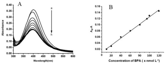 The quantification of BPA using the developed AgNPs-NH3 conjugate probe was carried out by applying the optimized conditions listed in Table 1. Figure 6 indicates that probe absorbance gradually decreased with increasing BPA amounts, up to 120 nmol L−1, remaining constant with the addition of higher amounts. Probe evaluation was performed by analyzing an analytical curve constructed using the net change in absorbance (Ao−A) versus the assessed BPA concentration (Figure 7A,B). The linear response (R2 = 0.998) covered a wide range, from final BPA concentrations of 10 nmol L−1 (2.2 ng mL−1) to 120 nmol L−1 (27 ng mL−1). The equation model regression curve was (Ao−A) = 1.2 × 106 [ BPA] + 0.009. The limit of detection (LOD) was 2.0 nmol L−1 (0.5 ng mL−1), calculated as 3 Sb/m, and the limit of quantification was 20.0 nmol L−1, calculated as 10 Sb/m, where Sb is the measured standard deviation of the AgNPs-NH3 conjugate (4.5 × 10−6 mol L−1 aqueous ammonia and dispersion 1.6 × 10−5 mol L−1) and m is the curve sensitivity [32]. The instrumental precision (2.3%) of the proposed AgNPs-NH3 probe-based method was evaluated via the coefficient of variation in the signal produced through the replicate analysis of ten BPA aliquots at the same concentration (50 nmol L−1). Intermediary precision (2.5%) was calculated through the coefficient of variation of the BPA recovery attained through ten independent analyte analyses at 50 nmol L−1 (Table 2).