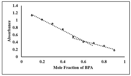 Jobs plot of the mole fraction of BPA as a function of absorbance.