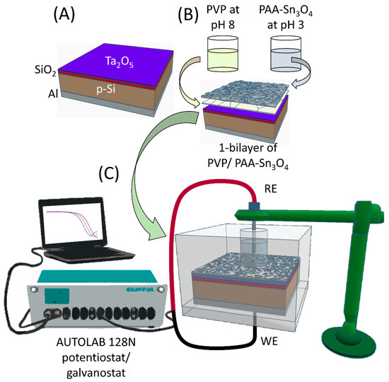 The LbL film was fabricated in duplicate and deposited on top of the electrolyte–insulator–semiconductor (EIS) sensor with a p-Si-SiO2-Ta2O5 structure (Figure 1A) measuring 1 cm2 in size. Figure 1B shows a representation of the LbL film sandwich. First, the EIS device surface was cleaned with acetone, followed by ethanol and ultrapure deionized water in an ultrasonic bath for 5 min at each step. Then, the sensor chip was inserted in a homemade, acrylic, O-ring-sealed electrochemical measuring cell used as a template. Subsequently, 500 µL of the PVP solution and the PAA-Sn3O4 dispersion were dropped into the reservoir over the chip alternately for 10 min. After each deposition, the liquid was removed, and the chip was rinsed with deionized water and dried with nitrogen. This process resulted in 1 bilayer with a PVP/PAA-Sn3O4 structure. Using this procedure, a pair of LbL films containing 5 bilayers was fabricated and named EIS-Sn3O4. The morphological characteristics of the EIS-Sn3O4 device surface were studied using field-emission scanning electron microscopy (FE-SEM; JEOL (Tokyo, Japan), model 7500F).