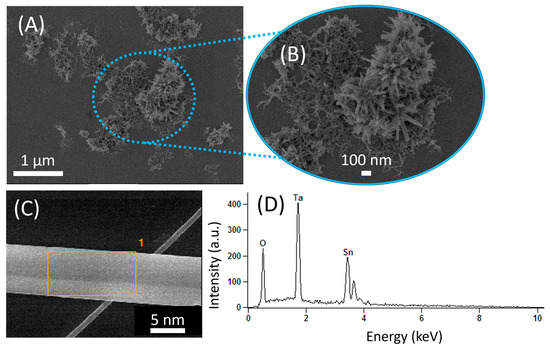 (A) FE-SEM image of a five-bilayer LbL film containing Sn3O4 nanobelts on the EIS chip, and (B) its enlarged image of nanobelt agglomeration. (C) FE-SEM image of Sn3O4 showing the region analyzed by EDS, followed by (D) the elemental EDS spectrum.