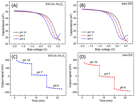 Figure 3 shows the C–V and ConCap curves for a five-bilayer EIS-Sn3O4 and a bare EIS sensor measured in a pH range of 4 to 10. The C–V curves (Figure 3A,B), occurring within a potential window of −2.0 V to 0.6 V (vs. Ag/AgCl), present a shift in the depletion region of both sensors (around −0.5 V to 0.5 V). The shift in this flat band region occurred for increasing positive potentials according to the pH increase due to concentration changes of the H+ ions that interact with the Ta2O5 sensor surface.