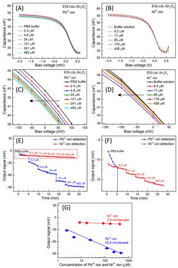 In contrast, only a small shift was observed, from −150 mV to 0.0 mV, in the C–V measurements for Ni2+ ion detection (Figure 4D). Here, based on surface reactions, the lower sensitivity exhibited by the EIS-Sn3O4 sensor may be associated with a weak exchange reaction between Ni2+ and H+ ions from the active sites on the film surface. This behavior could be related to the lower electronegativity of nickel than lead cations [38].