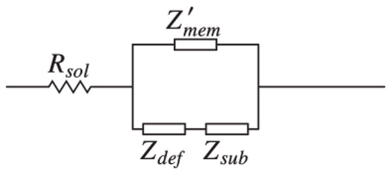 where —radius of the conductive pore in the bilayer and —distance to the boundary of the region which can also be expressed as defect density , —capacitance of the bilayer, —capacitance of the Helmholtz layer at the substrate, , and , . Around characteristic frequency fmin, dominant contribution to overall impedance comes from . This impedance is characterized by and , as shown in Equation (2). Out of all the physical parameters that are inside and , and are the ones we address most carefully in the scope of this work. Turns out that by fitting EIS spectra, only ratio of can be calculated. However, estimates for [28] and [6] values are available in the literature. Given certain values for and , in a vicinity of fmin is dependent mostly on or [19]. Therefore, position of fmin can be used to estimate surface density of conductive defects by using empirical relationship from Equation (3) [19].