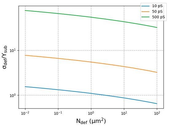 How much can the sub-membrane resistance contribute to the measured EIS? According to [19], the answer to this question depends on the ratio between the impedance of an ion channel (defect) and the impedance of the sub-membrane. Figure 3 shows these ratios for several ion channels with different conductivities from 10 pS to 500 pS. Since the impedance of the sub-membrane reservoir is determined by the defect density [19], the ratio σdef/Ysub also depends on Ndef. Ysub also depends on the physical parameters of the sub-membrane, such as the specific resistance. The latter can be estimated from AFM measurements and was found to be Ohms · cm [28].