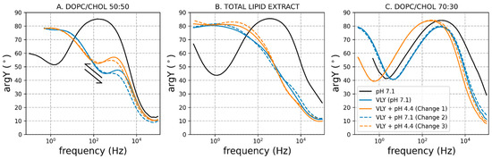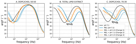 Changing the pH to 7.1 results in a shift of the fmin position towards higher frequencies in all three lipid compositions (blue line, Figure 4A–C). This shift in the fmin position of the tBLMs indicates an increase in the electrical conductivity of the membranes. Such an effect, an increase in membrane conductivity at higher pH, was also observed by Vitalii I. Silin [21] and C. G. Cranfield [20] in their studies. Furthermore, the shift in fmin when pH was changed from 4.4 to 7.1 resulted in a consistent shift in a logarithmic scale across all membrane compositions (Table 1). The corresponding Bode plots depicting magnitude vs. frequency dependencies are provided in the Supplemental material section (Figure S1A–C). This pattern of pH-change-induced fmin shifts was consistent when the membranes were subjected to multiple pH changes between pH 4.4 and 7.1 (dashed lines, Figure 4A–C).