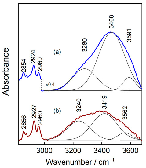 A positive facing O–H stretching mode in Figure 8a indicates a surge of water content in the tBLM structure at pH = 7.3 compared to tBLMs exposed to a more acidic environment, pH = 4.4 (Figure 8b). The O–H spectral mode may be deconvoluted into three Gaussian–Lorentzian shape components. Two lower frequency components were previously defined as “network water” at 3250 and 3400 cm−1, the former related to a solid-like network of strongly hydrogen-bonded water molecules and the latter (most intense component) to liquid state of water. The “multimer water” of water molecules forming a disturbed hydrogen-bond network may be associated with spectral component visible at 3600 cm−1 [53,54]. The positive intensity and shape of OH mode at pH 4.5 indicates that the system did not fully recover from structural rearrangements after exposure to pH 7.3. For more quantitative analysis, integral intensity ratios Rnetwork and Rmultimer are calculated and presented in Table 8. Rnetwork indicates a population of strongly coupled water molecules, while Rmultimer is related to a disturbed hydrogen-bond network [53]. For comparison, we have also measured bulk water placed on pristine silicon crystal in ATR mode (Table 8). In SEIRAS at pH 7.3, a surge of water to the sub membrane is detected, characterized by an increased portion of multimer and a rather small portion of network water compared to a bulk water ATR spectrum. Moreover, close analysis of peak positions revealed a noticeable upshift as high as 64 cm−1, which points to decreasing H-bonding interaction among water molecules near the lipid membrane. Subsequent shifting back to pH 4.5 sharply decreased the water amount in the tBLM; however, there remained an excess of it compared to the as-prepared tBLM. Thinning of lipid bilayer would explain positive bulk-like water mode; however, previous studies have found little to no dependence between pH and lipid layer thickness [20,21].