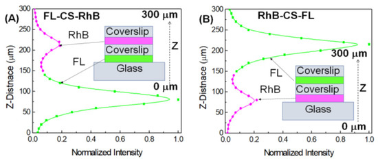 Confocal fluorescence intensities measured along the Z-axis for structures of (A) FL-RhB and (B) RhB-FL in two different locations separated by a cover slip (CS). The observed 170 µm distance between the intensity peaks are consistent with the 170 µm thickness of cover slip.