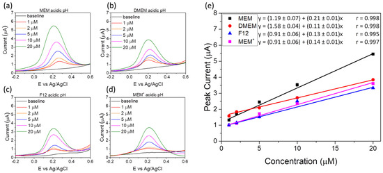 The results related to the ASV experiments performed after the medium acidification are reported in Figure 3. Higher current values and higher slope values are visible with respect to measurements performed at physiological pH, thus demonstrating the higher sensitivity of the system in acidic/diluted conditions. A linear correlation was obtained for all the cell culture media.
