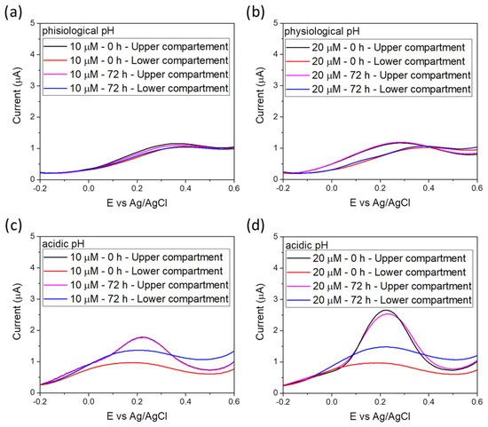 Under physiological conditions, the voltammetric signal was barely visible (as already reported in Figure 2d), whereas it can be well distinguished under acidic conditions (Figure 4). At T0 the peak current for 10 µM concentration was about 2 µA, while that for 20 µM was about 2.5 µA (Figure 4c,d). Obviously, the observed currents correspond to a concentration that is halved when compared to the original one, as the acidification/dilution process was carried out before the measurement. Indeed, the peak current of 2 µA matches with the peak of 5 µM concentration in the calibration line in Figure 3e, while 2.5 µA corresponds with the 10 µM concentration.